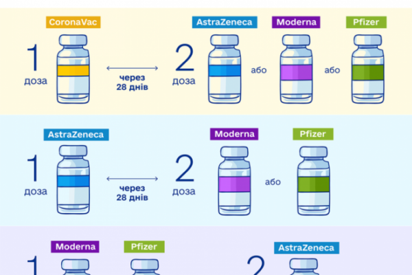 В Україні змінили схеми використання різних вакцин для основного курсу щеплень від COVID-19, згідно з якими вакцину CoronaVac від Sinovac Biotech тепер можна поєднувати з векторними (AstraZeneca) та мРНК-вакцинами (Moderna або Comirnaty від Pfizer-BioNTech). Крім того, після Moderna або Pfizer тепер можна застосовувати вакцину AstraZeneca.