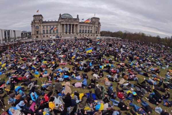 У Берліні сотні людей лягли на землю перед Бундестагом, аби нагадати, що українців вбивають, поки ЄС купує російську нафту і газ.
