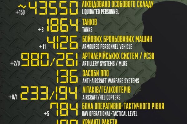 Збройнісили України ліквідували приблизно 43 550 російських окупантів (+150 за останню добу).