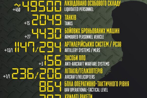 Загальні бойові втрати рф від початку війни – близько 49,5 тис. осіб, 236 літаків, 206 гелікоптерів, 2049 танків та 4430 броньованих машин.