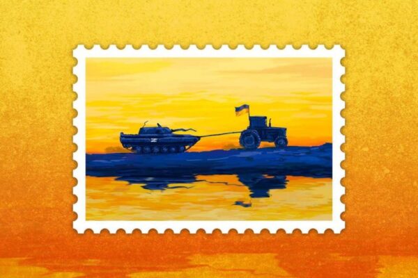 На поштовій марці «Доброго вечора, ми з України!» відтворено реальні події, які мали місце на Миколаївщині: український трактор тягне покинутий російський танк.