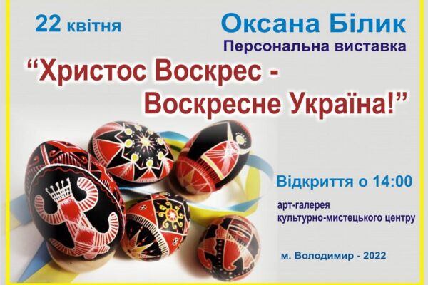 У п’ятницю 22 квітня у арт-галереї культурно-мистецького центру о 14 годині відбудеться відкриття виставки «Христос Воскрес – Воскресне Україна!».