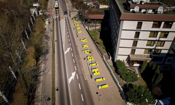 Навпроти посольства рф у Варшаві на тротуарі з’явився синьо-жовтий напис великими літерами «Слава Україні!».