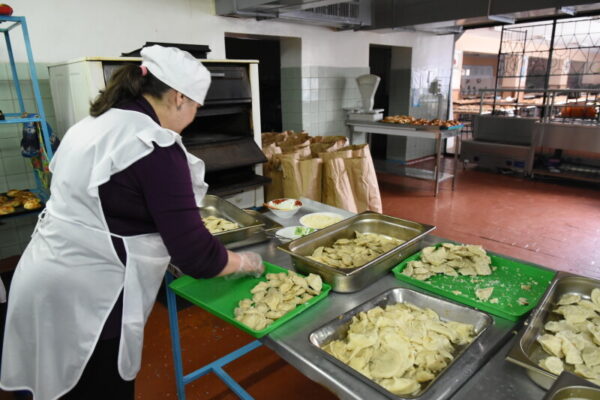 Валентина Галкіна та семеро її колег по кухні працюють над «солдатськими» обідами від п’ятої ранку. Кажуть – так наближають перемогу над російським окупантом. Сьогодні у меню: каша, котлета, салат, борщ і обов’язково — здоба.