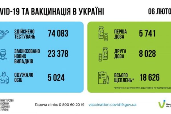 За добу 06 лютого в Україні зафіксовано 23 378 нових підтверджених випадків коронавірусної хвороби COVID-19 (з них дітей – 2 242, медпрацівників – 394).