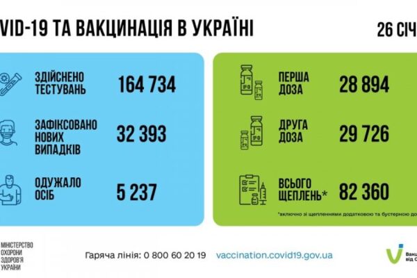 За добу 26 січня в Україні зафіксовано 32 393 нових підтверджених випадків коронавірусної хвороби COVID-19 (з них дітей – 4 847, медпрацівників – 797).