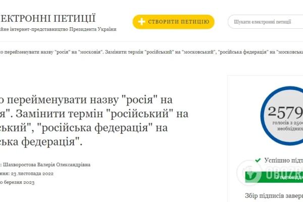 Електронна петиція з вимогою офіційно перейменувати назву «росія» на «московія», а також замінити термін «російський» на «московський» і «російська федерація» на «московська федерація» зібрала необхідних для розгляду 25 000 підписів.