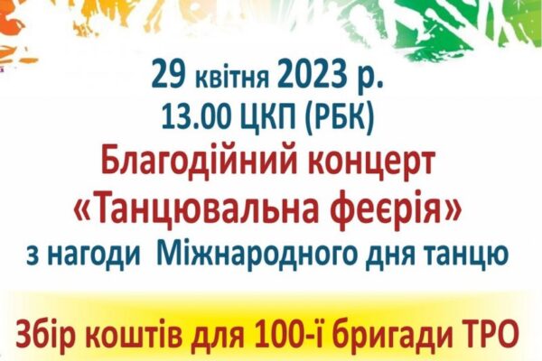 29 квітня у центрі культурних послуг (РБК) відбудеться благодійний концерт з нагоди Міжнародного дня танцю “Танцювальна феєрія”. Концерт, який розпочнеться о 13:00, матиме благодійну мету, адже протягом дійства буде проводитись збір коштів для 100-ї бригади ТрО.