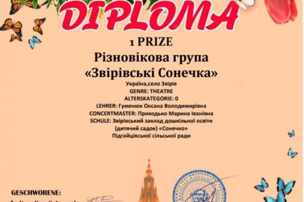 Казочка Наталі Забіли “Кіт та Півник” у виконанні малят Звірівського ЗДО “Сонечко” Підгайцівської сільської ради здобула 1 місце у Міжнародному конкурсі “Свято Весни 2023” в столиці Австрії – місті Відень.