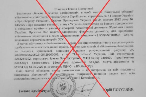 Зловмисники знову розсилають листи нібито від Волинської ОВА з метою збору коштів для ЗСУ.