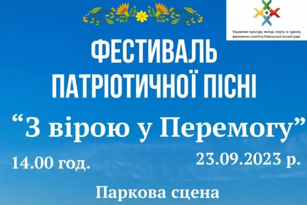 23 вересня у Ковелі на парковій сцені проходитиме фестиваль патріотичної пісні «З вірою у Перемогу». Початок – о 14.00 год.