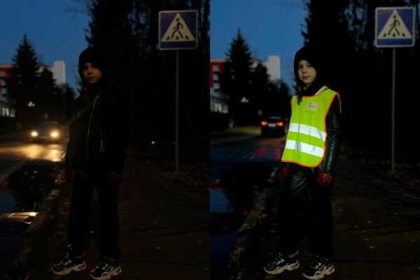 На світлинах — 8-річна лучанка Настя. Вона вирішила наочно показати, як в темну пору доби водій бачить пішохода “з” та “без” флікерів.