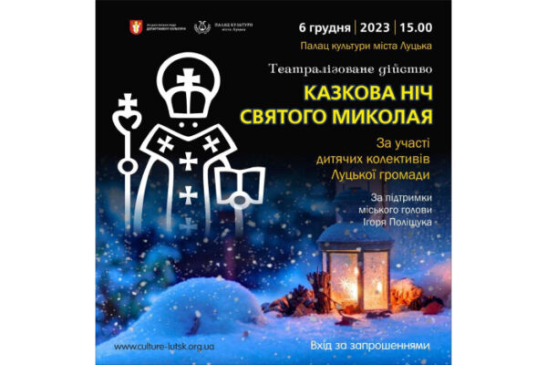 У Луцьку запрошують 6 грудня 2023 року у Палац культури міста на театралізоване дійство «Казкова ніч Святого Миколая».
