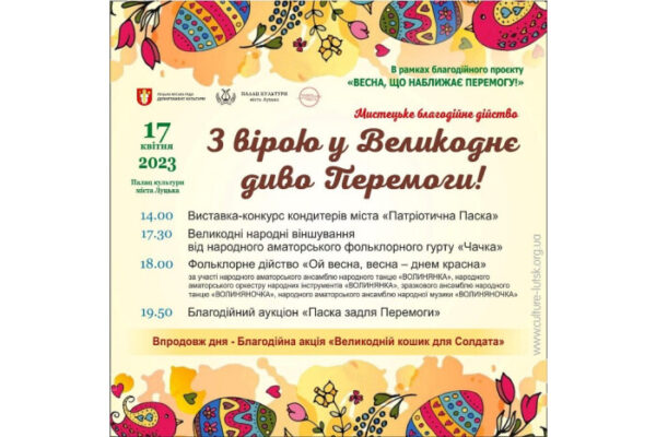 17 квітня у Палаці культури міста Луцька відбудеться мистецьке благодійне дійство «З вірою у Великоднє диво Перемоги!» в рамках благодійного проєкту «Весна, що наближає Перемогу!».