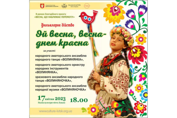17 квітня у Луцьку відбудеться фольклорне дійство “Ой весна, весна — днем красна”. Місце провдення — Палац культури м. Луцька.