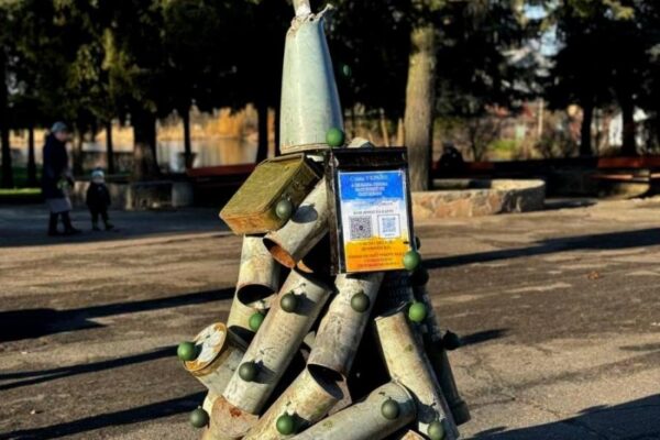 Інсталяцію новорічної ялинки, виготовлену зі снарядів різного калібру, привезених із зони бойових дій, встановили на центральній площі Родищ місцеві волонтери, аби у ці різдвяні дні ми не на мить не забували, що у нас йде війна.