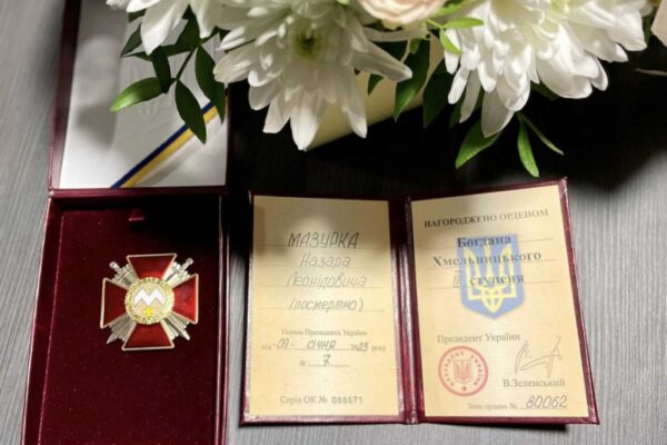 Згідно з Указом Президента України №7/2023 за особисту мужність і самовідданість, виявлені у захисті державного суверенітету та територіальної цілісності України, вірність військовій присязі посмертно нагородили старшого лейтенанта Назара Мазурка орденом Богдана Хмельницького III ступеня.