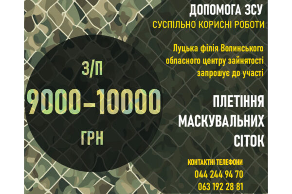 Луцька філія Волинського обласного центру зайнятості запрошує до участі в суспільно корисних роботах з плетіння маскувальних сіток для Збройних сил України.