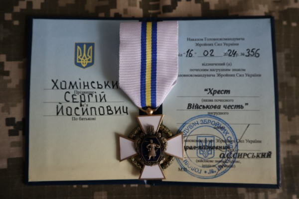 Начальник служби зв’язків з громадськістю волинської бригади Сил територіальної оборони ЗСУ Сергій Хомінський отримав відзнаку Головнокомандувача Збройних сил України Олександра Сирського «Хрест Військова честь» .