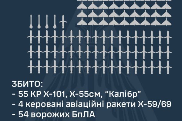 Командування Повітряних сил ЗСУ заявило про збиття 113 повітряних цілей зі 184, запушених сьогодні ворогом. Було збито: 55 крилатих ракет…