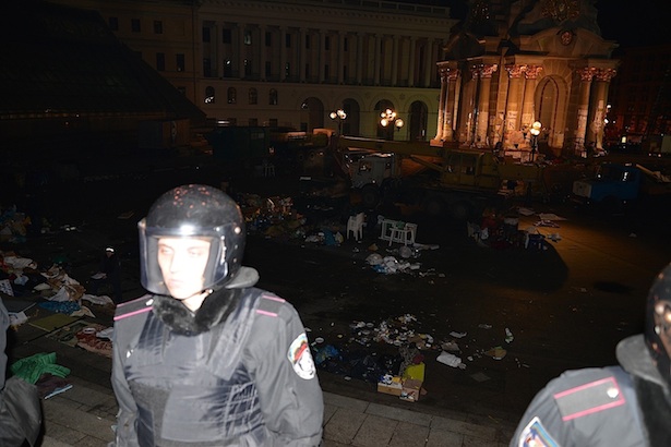 По прибуттю на місце міліції мітингувальники, грубо порушуючи громадський порядок, почали кидати в правоохоронців сміттям, склянками, пляшками з водою та підпаленими палками. Після цього міліціонери відтіснили мітингувальників з Майдану Незалежності.