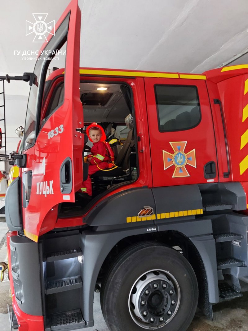 “27 червня до рятувальників 1-ї Державної пожежно-рятувальної частини міста Луцьк на власне день народження разом з батьками завітав хлопчик Даніл, йому виповнилось 5 років і в майбутньому він мріє стати пожежником.