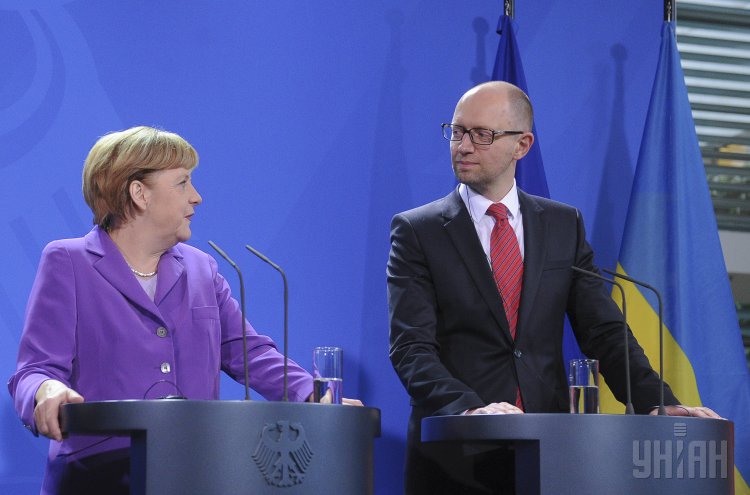 УНІАН: Ангеля Меркель і Арсеній Яценюк під час однієї з прес-конференцій.