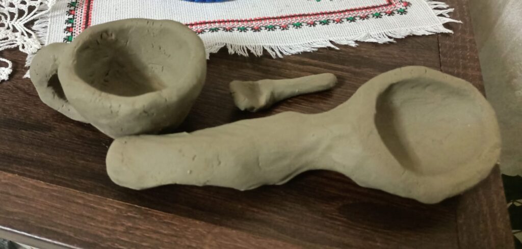 Відтак, майстри показали групі військовослужбовців, які перебувають на лікуванні, елементарні прийоми роботи з цим матеріалом, а потім дорослі бойові учні власними руками створили прості, але символічні речі – кружку і ложку.
