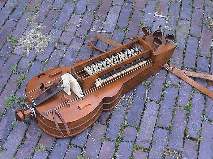 свідчать чотири кілочки. Звучить інструмент завдяки тому, що колесо треться об
