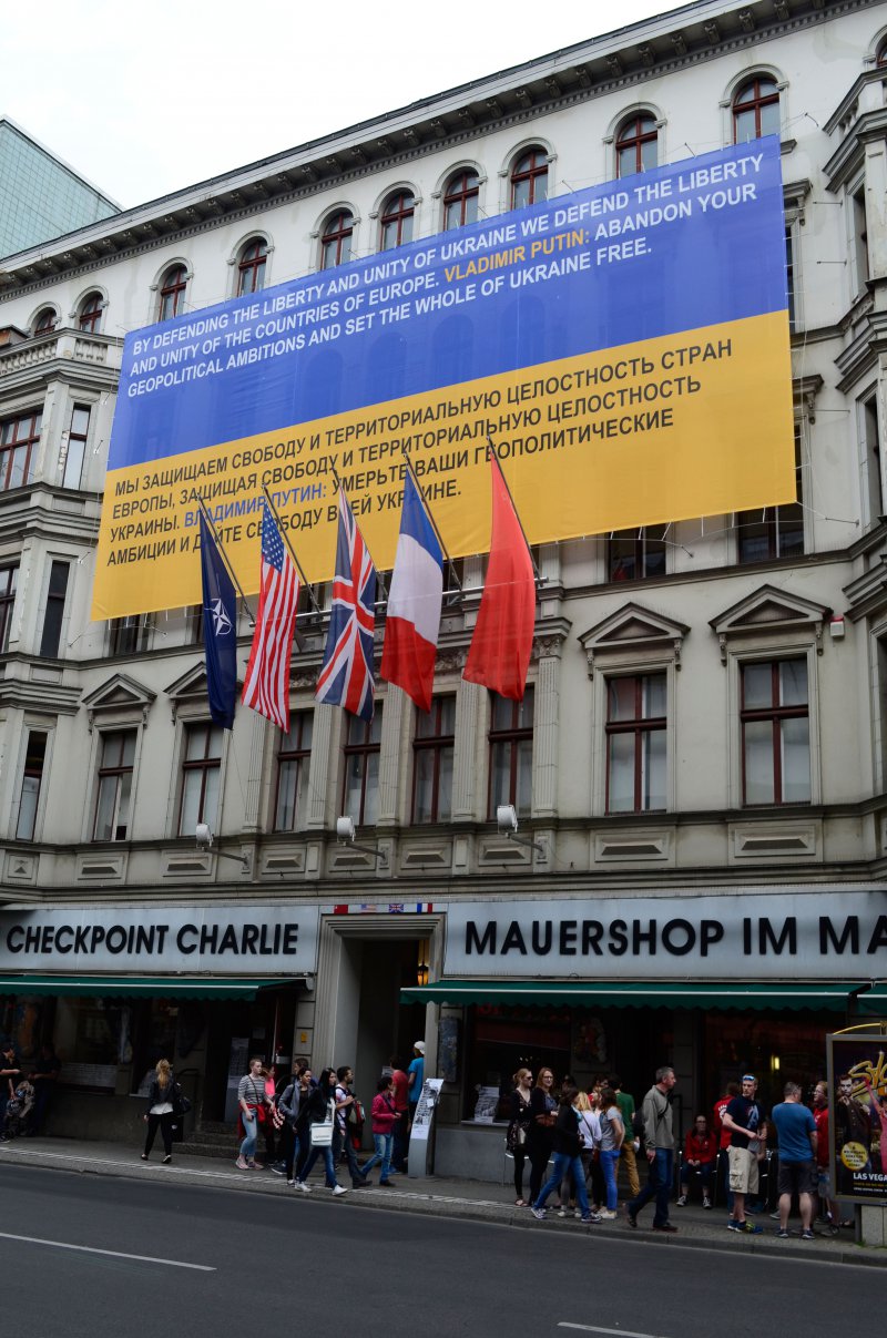 Наснаги додали враження від відвідин чекпойнту армії США – меморіального об’єкта, який зберігся тут з часів Другої світової та «холодної» війн. Саме тут був блокпост, який розмежовував американську та радянську зони окупації Берліна, і саме тут невідомі проукраїнські сили на споруді музею розгорнули гігантський синьо-жовтий плакат із закликом до Кремля припинити ганебну війну в Україні. Тому навіть «колорадські туристи», які фотографувалися тут в оточенні одягнутих в американську військову форму часів минулої війни чоловіків, не могли не бачити очевидного: путінський режим сьогодні все більше нагадує гітлерівську систему…
