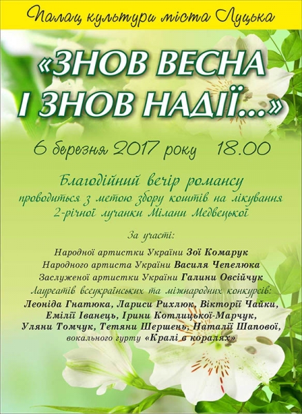 Палаці культури міста відбудеться благодійний вечір романсу «Знов весна і знов