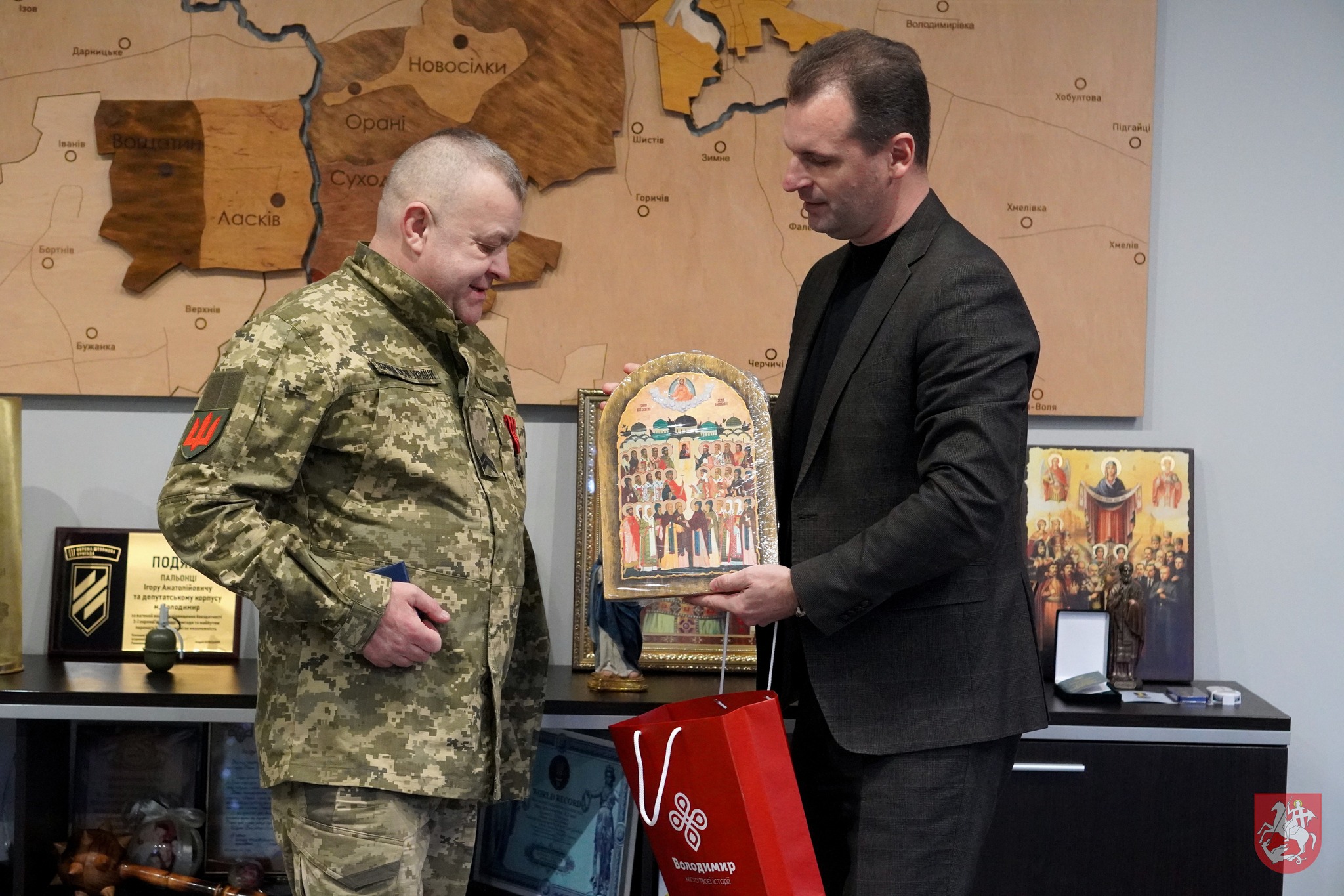 Привітав військовослужбовця із такою важливою нагородою міський голова Ігор Пальонка, від імені усієї громади подякував йому за захист, мужність і звитягу та подарував як оберіг ікону “Всіх святих землі Волинської”.