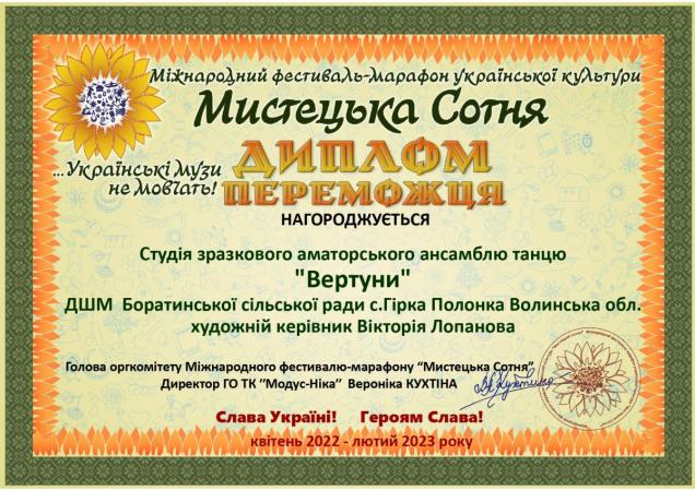Онлайн-змагання відбувалося у шести номінаціях: «Українська хореографія», «Українська пісня», «Український театр», «Українська музика», «Українська поезія», «Українське інклюзивне сценічне мистецтво». У номінації «Українська хореографія» перемогу здобула студія зразкового аматорського ансамблю народного танцю «Вертуни» (керівниця — Вікторія Лопанова) ДШМ Боратинської сільської ради (село Гірка Полонка). Для участі в конкурсі колектив представив три свої номери: «Скакунець», «Полісяночка» та «Березнянка». Всі ці роботи принесли колективу заслужену перемогу у номінації та ще одну нагороду у скарбничку досягнень.