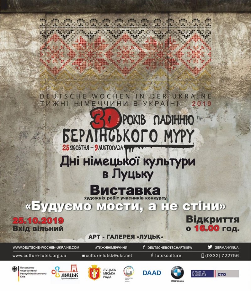 Довідка: Проєкт «Луцьк – будуємо мости, а не стіни!» ініційований департаментом культури Луцької міської ради спільно з ГО «Товариство німці Волині» та лекторатом DAAD при Східноєвропейському національному університеті імені Лесі Українки та реалізований за підтримки Посольства ФРН в Києві. Заплановано 15 різноманітних заходів, які відбудуться протягом 25 жовтня – 8 листопада 2019 на різних локаціях міста.