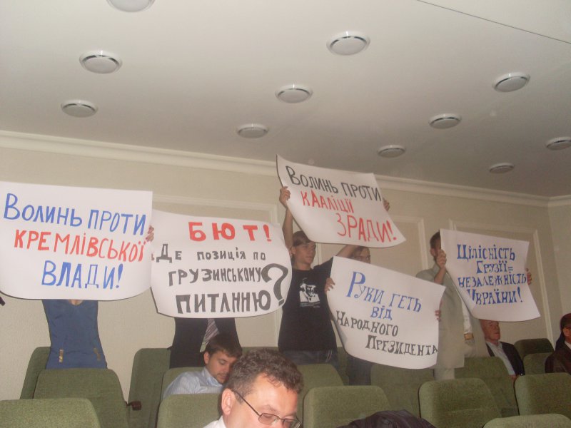 У 2010-му Ігор Гузь і сам активно «порочив «Батьківщину». Зокрема – розвішував під час сесії перед тодішнім лідером бютівців Волині та головою облради Анатолієм Грицюком російський стяг і приводив до зали молодиків із плакатами (на фото).
