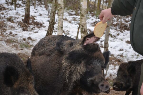 Ліс, застелений білим покривалом, заворожує тишею. Дерев’яна огорожа з сіткою вказує на наявність вольєра. На ловця, як кажуть, і звір біжить. Дикі вепри видають себе відразу. Та варто було наблизитися до паркану, як звірина