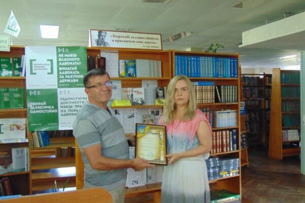 За співпрацю, активну участь у заходах та вагомий внесок щодо реалізації загальнонаціонального проекту Міністерства юстиції «Я МАЮ ПРАВО!», формування правової культури та правової свідомості у суспільстві, підвищення рівня знань громадян та з нагоди державного свята – Дня незалежності подякою начальника Головного територіального управління юстиції у Волинській області відзначена завідувач відділу читальних залів Волинської державної обласної універсальної наукової бібліотеки імені Олени Пчілки