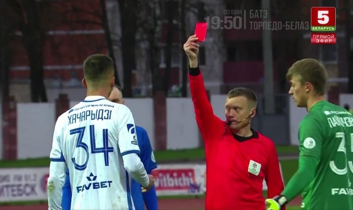 фото «Рressball.by»: суддя Сєргєй Чістов показує Єгенові Хачеріді червону
