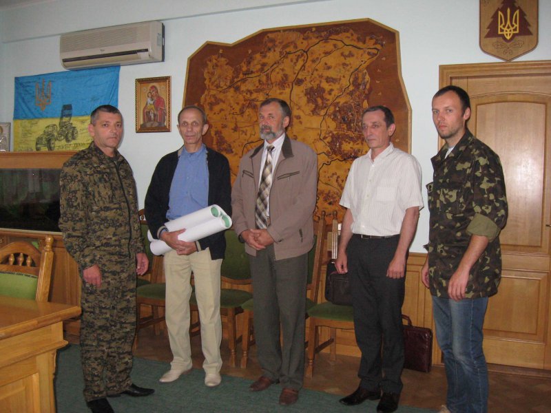 На фото: зліва направо: начальник ВОУЛМГ Василь Мазурик, директор ДП «Поліський філіал УкрНДІЛГА» Олександр Тарасевич, старший науковий співробітник філіалу Василь Бородавка, науковий співробітник філіалу Ігор Гулик, молодший науковий співробітник філіалу Олег Жуковський.