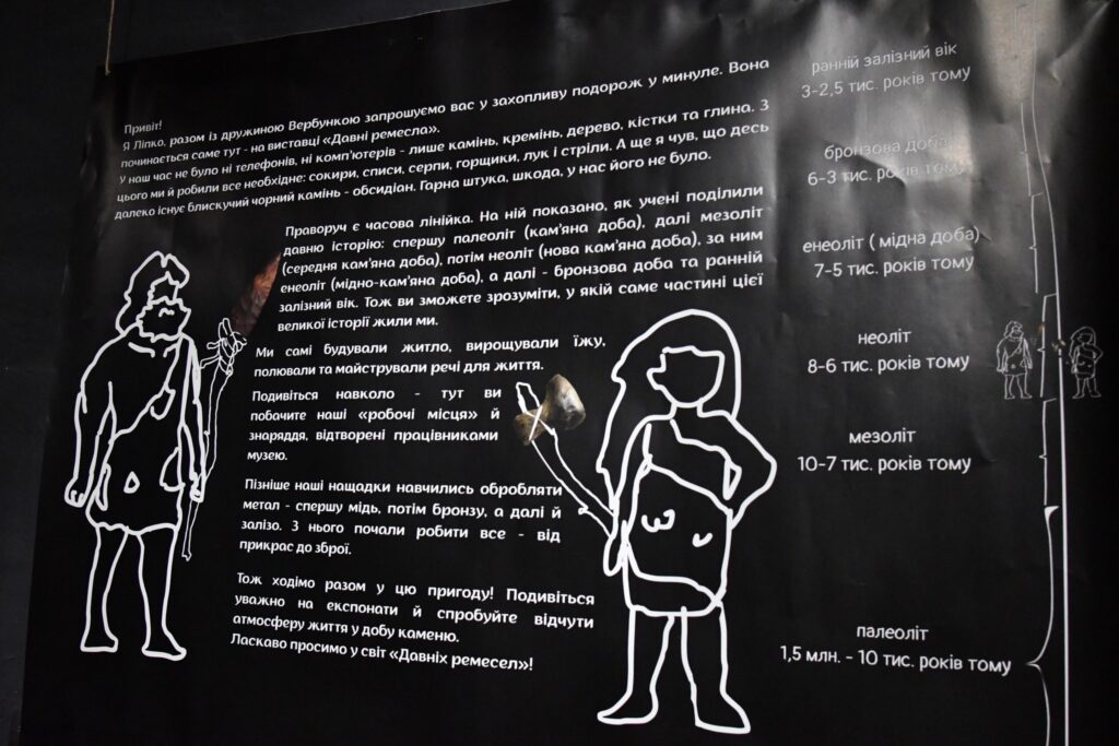 Виставка спонукає глядача поринути у захопливу подорож в минуле. Автори мали на меті нагадати сучасникам, як велося людям, які не мали ні електрики, ні інтернету, а лише камінь, дерево, кістки та глину. В експозиції відтворено знаряддя праці та мисливства, верстати і речі повсякденного побуту від кам’яної доби до раннього залізного віку.