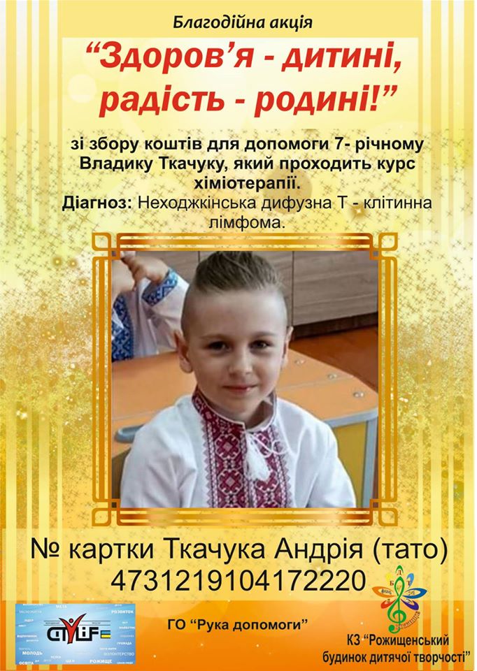 У рамках Благодійної акції “Здоров’я – дитині, радість – родині! ” 26-го лютого о 17-й годині у РД “Просвіта” м.Рожище, відбудеться концерт на підтримку Владислава Ткачука. Семирічний хлопчик проходить стаціонарне лікування (курс хіміотерапії. Діагноз – неходжкінська дифузна Т-клітинна лімфома). Про це повідомили на сторінці “Молодіжного простору”.