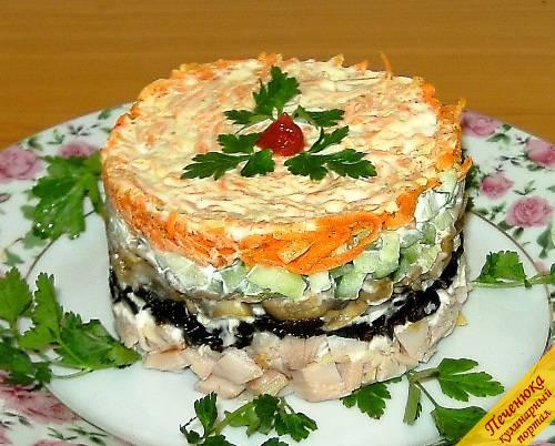 майонезом. Далі шар картоплі (теж порізаної кубиками), майонез, гриби, дрібно