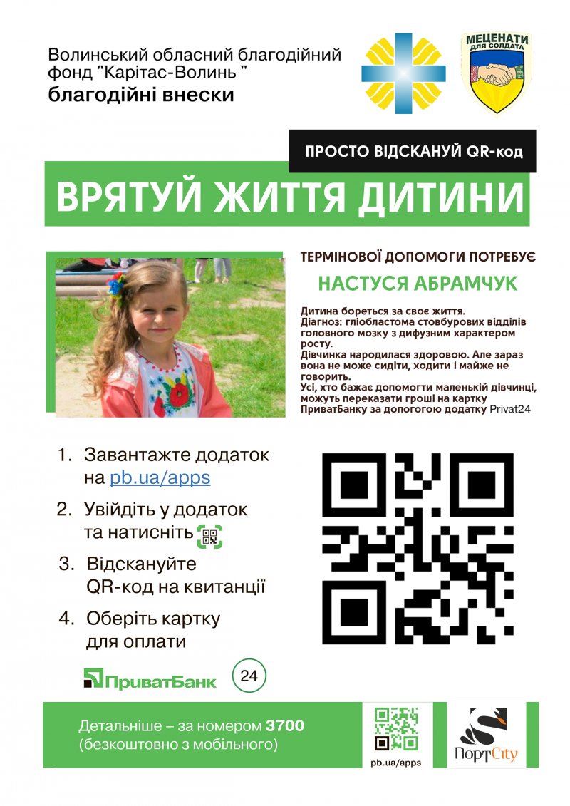 можна переказати кошти для Настя Абрамчук. За допомогою QR-коду благодійні