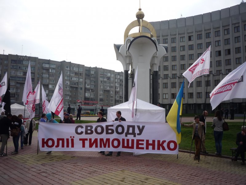 Допоки Президент України їхав із Музею Волинської ікони на Київський майдан, тут зібралася жменька опозиціонерів із прапорами «Батьківщини».