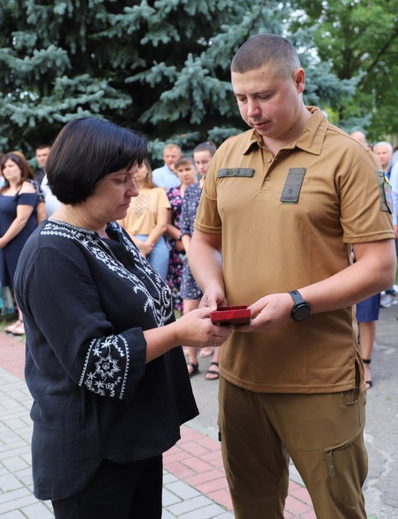 Сьогодні під час тематичного заходу до Дня Державного Прапора високу нагороду начальниця районної військової адміністрації Ольга Ващук разом із міським головою Віктором Пасем і начальником Камінь-Каширського районного територіального центру комплектації та соціальної підтримки Валентином Борухом передали в руки дружині полеглого Героя Світлані.