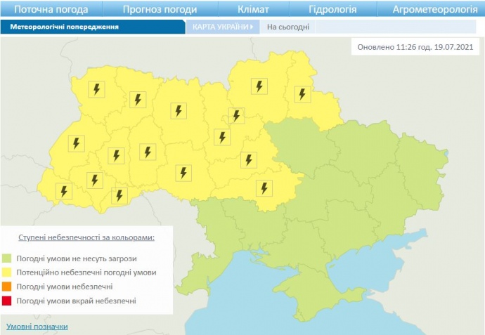 За інформацією УкрГідрометцентру, 19 липня очікуються грози, вдень місцями град та шквали 15-20 м/с.