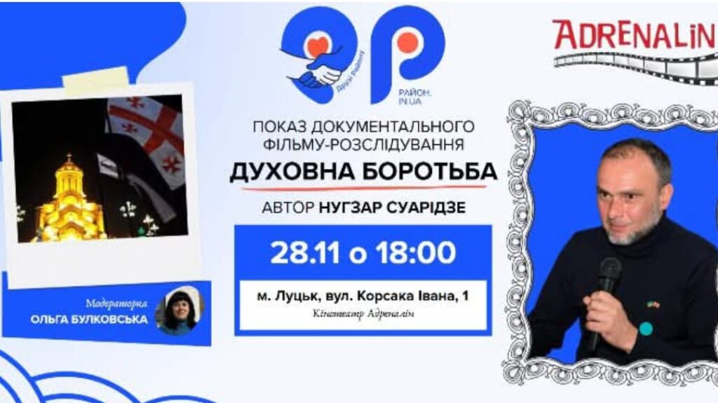 Показ фільму-розслідування «Духовна боротьба» та зустріч із автором, грузинським журналістом Нугзаром Суарідзе, відбулися вчора в одному з кінозалів кінотеатру «Адреналін». Кінострічка не тільки про історію виникнення та боротьби за незалежність від мокви українського та грузинського православ’я…