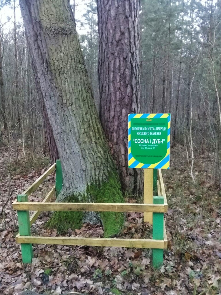 ботанічна пам’ятка цікава тим, що сосна і дуб зрослися між собою гілкою у трьох