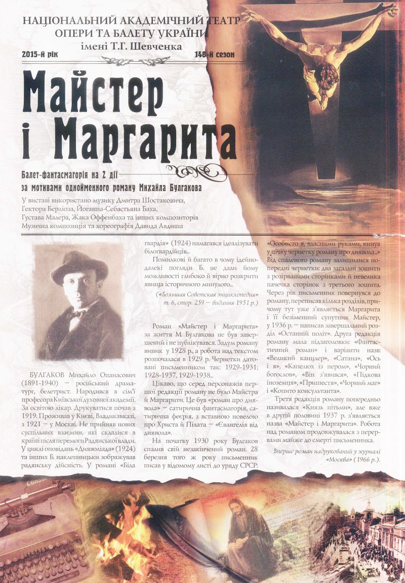 Коли переглядав балет-фантасмагорію на дві дії «Майстер і Маргарита» за мотивами однойменного твору Михайла Булгакова в Національному академічному театрі опери та балету України ім. Тараса Шевченка (148-й сезон!), подумки повертався до текстового матеріалу. Роман «Майстер і Маргарита» за життя самого Михайла Опанасовича не був завершеним і не публікувався.