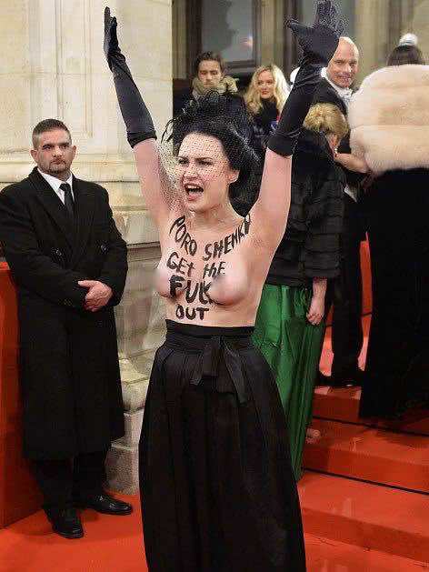 міжнародного дійства підійшла українська активістка «Femen» Аліса Виноградова з червоної доріжки звернулася до аристократичної публіки з пропозицією